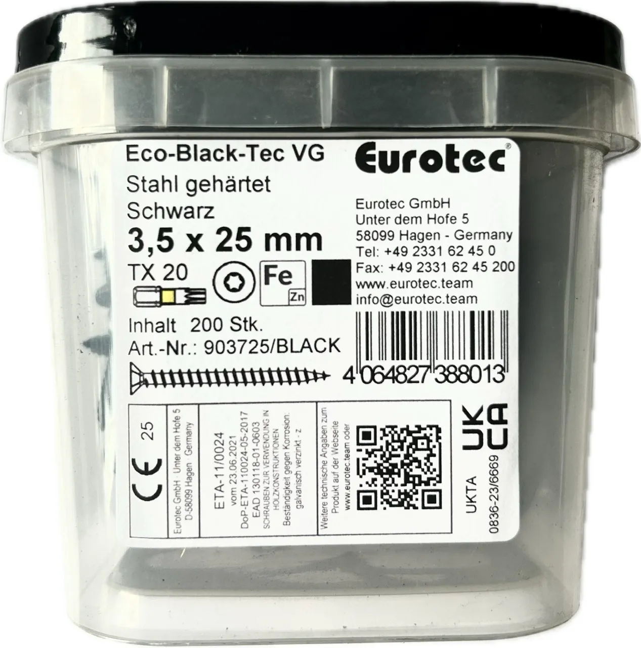 Eco-Black-Tec wykonany z powlekanej na czarno i hartowanej stali węglowej to wkręt do drewna, który jest używany głównie w pomieszczeniach.