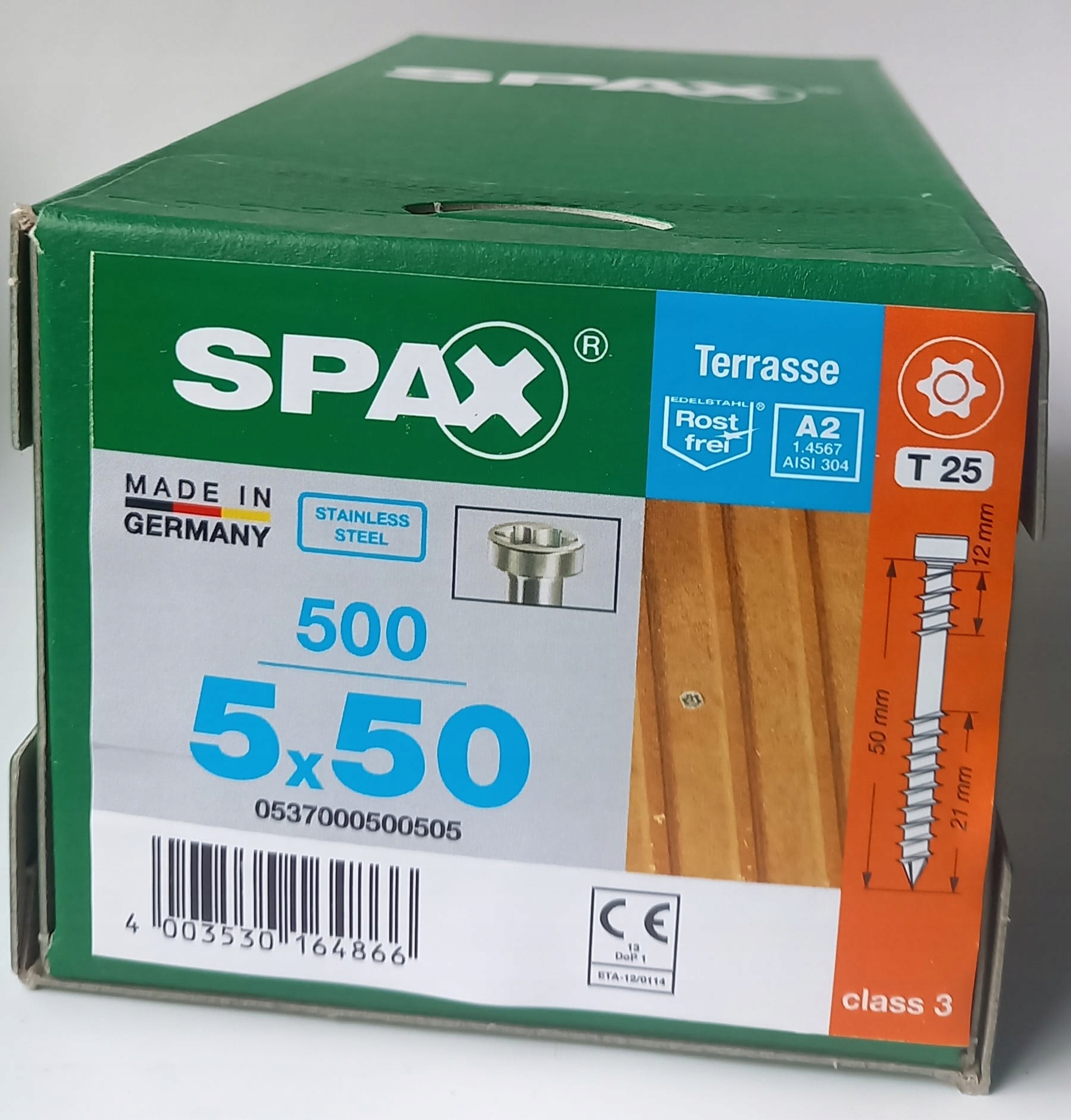 Stosowanie wkrętów SPAX nie wymaga nawiercania w miękkim drewnie, co usprawnia pracę przy montażu deski tarasowej (modrzewiowej).