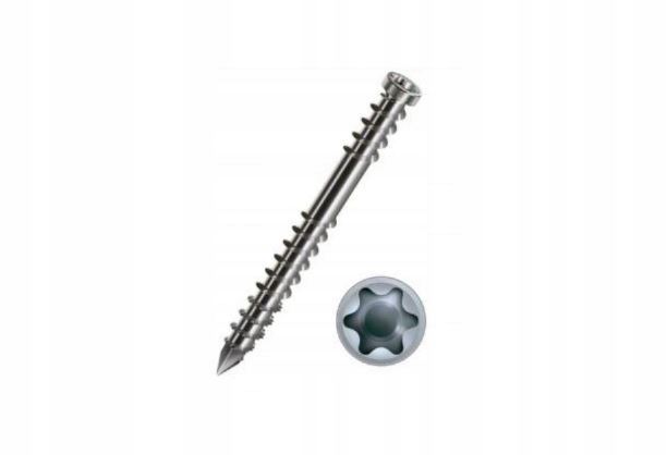 Wkręt ze stali węglowej w specjalnej powłoce antykorozyjnej WIROX C4 przeznaczony do montażu tarasów z “miękkiego” drewna europejskiego (modrzew, sosna, świerk) oraz deski tarasowej ,,modyfikowanej” (Thermo-Drewno)